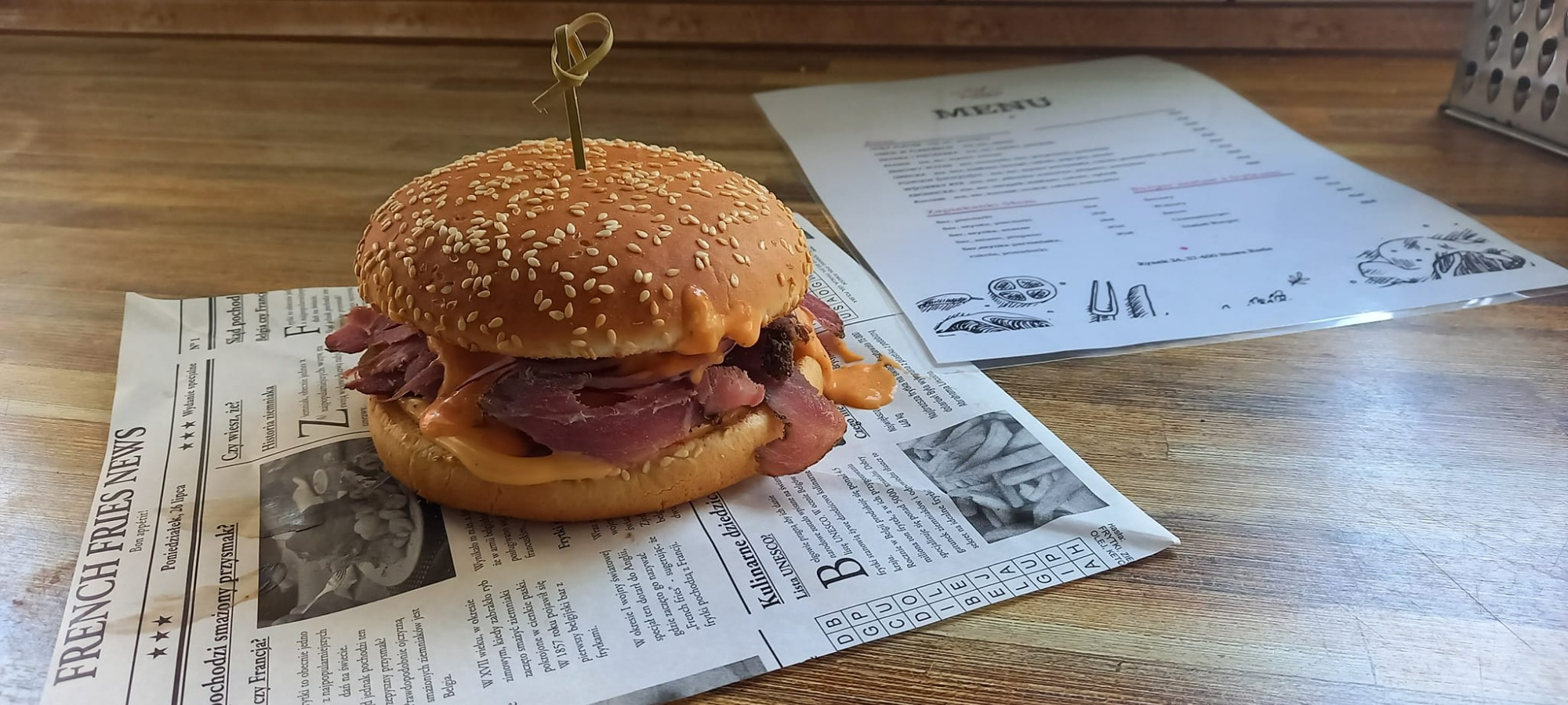 wołowina(200g), oscypek, żurawina, boczek grillowany, sałata, , sos tatarski, firmowy, BBQ, pomidor, cebula, ogórek, frytki 150g -